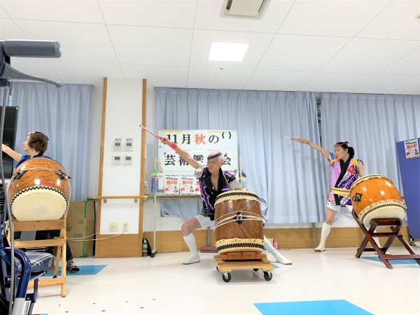 先月、八王子寿太鼓の皆様が演奏しに来設しました。